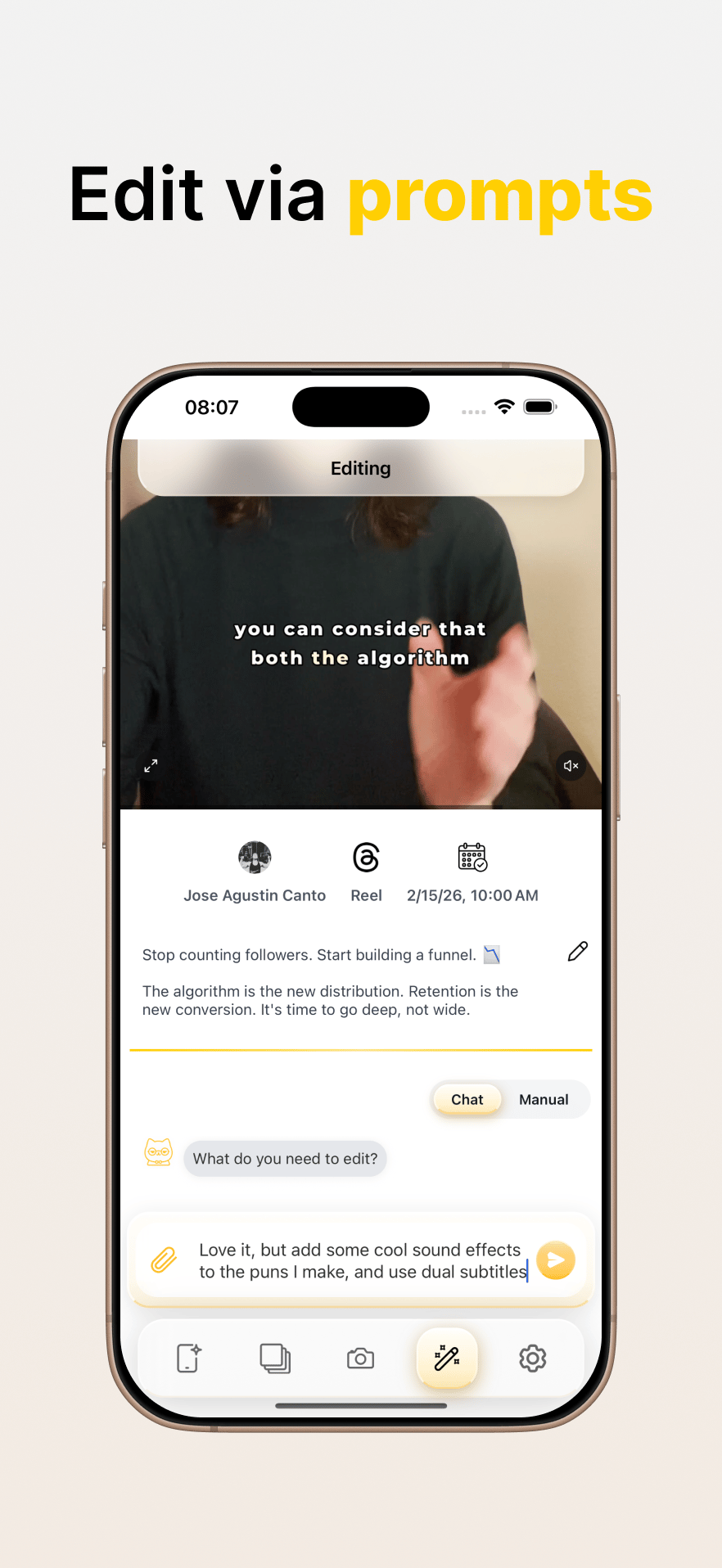 Camera · In-app capture with teleprompter, controls and effects.