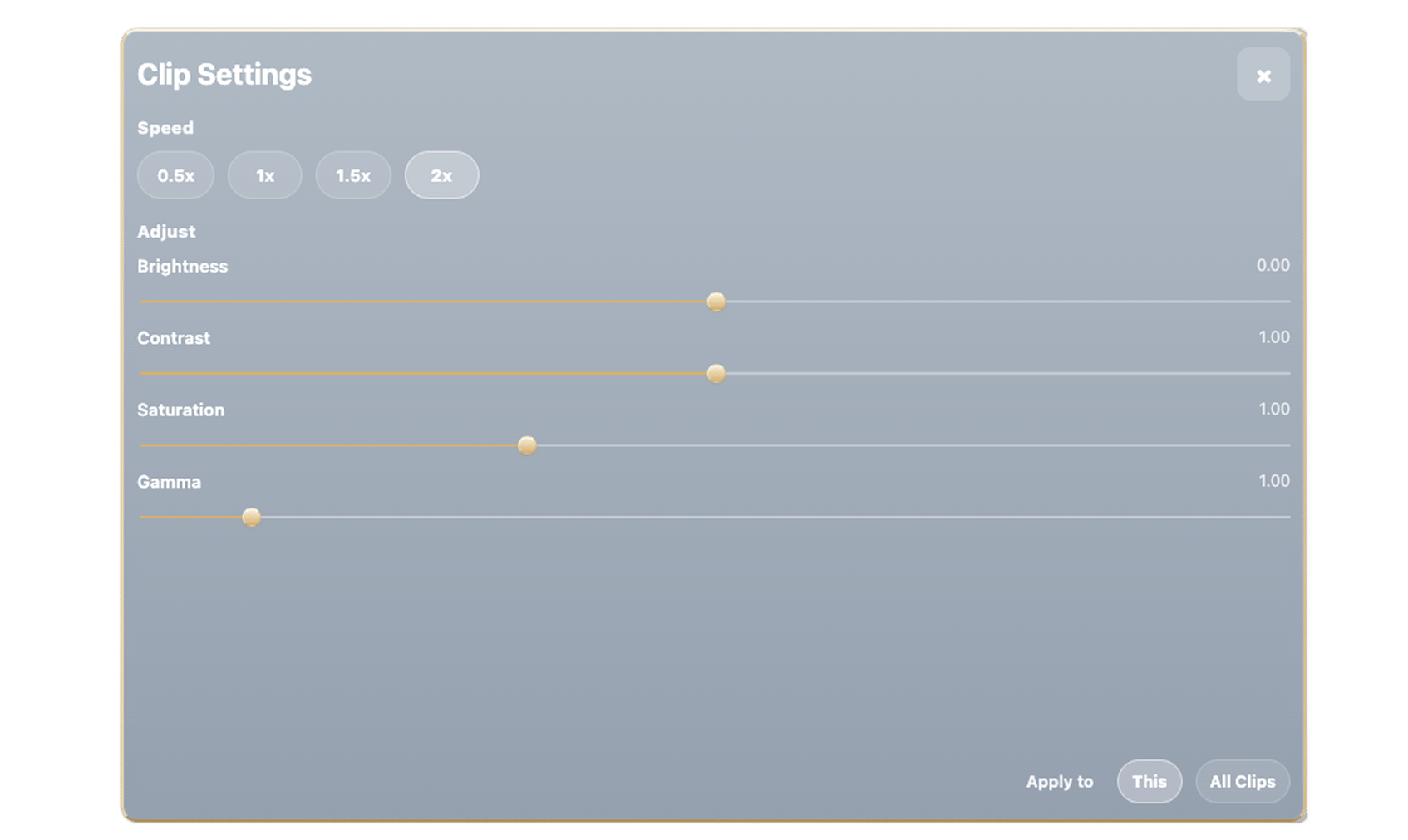 Rkive can now apply video adjustments on a clip-per-clip basis. Crop, rotate, speed and color adjustments can be specific to each part of the video. You can see them in the “Clip” panel. Double tap on top of a clip in the timeline to open it.